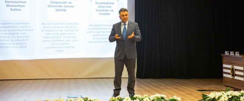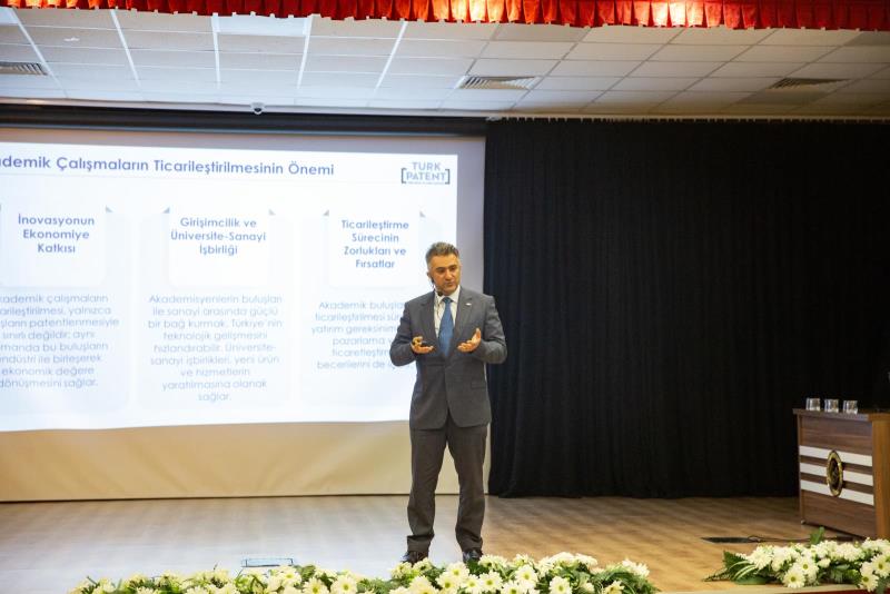 Açılış konuşmalarının ardından Türk Patent ve Marka Kurumu Başkanı Prof. Dr. Muhammed Zeki Durak, 'Sınai Mülkiyet ve Ticarileşme' başlıklı sunumunu gerçekleştirdi. Sayın Başkan sunumunda; akademisyen ve öğrencilerin yenilikçi fikirlerinin tescil süreçlerinin yanı sıra, bu buluşların ticarileşerek ekonomik bir değere dönüşmesinin önemine dikkat çekti. Patent ve faydalı model kavramlarının stratejik rolüne değinilen sunumda, üniversite-sanayi iş birliğinin gelecekteki ticarileşme fırsatları üzerine değerli bilgiler paylaşıldı.